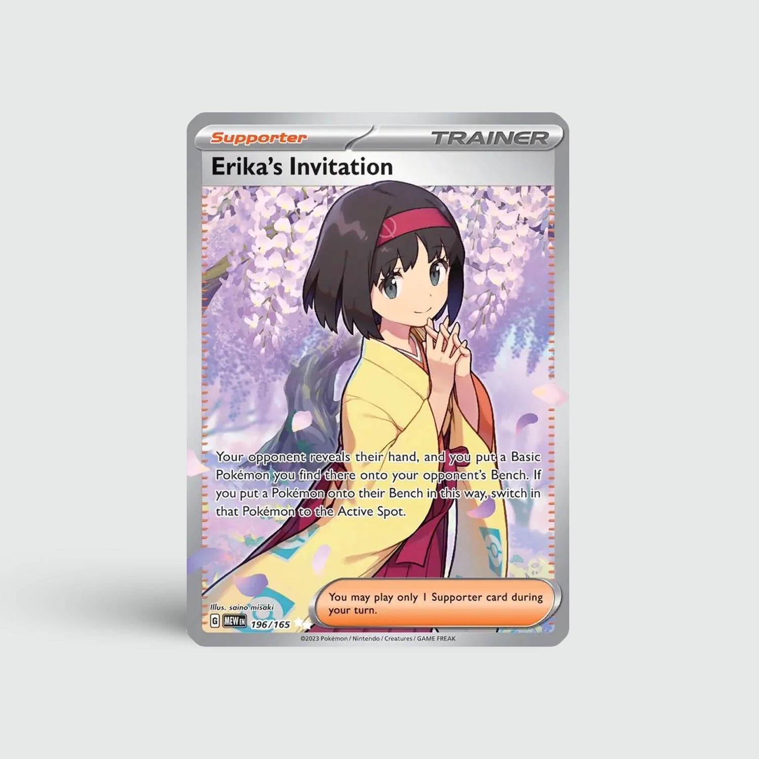 Erika's Invitation laat je specifieke Pokémon uit het deck van je tegenstander kiezen, wat zorgt voor tactische controle. Een stijlvolle Trainer-kaart met Kanto-nostalgie.