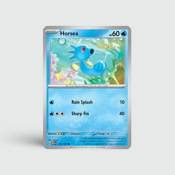 Horsea is een speelse Water-type Pokémon met een frisse, nostalgische illustratie. Perfect voor verzamelaars die de originele Kanto- vibes willen in hun binder.