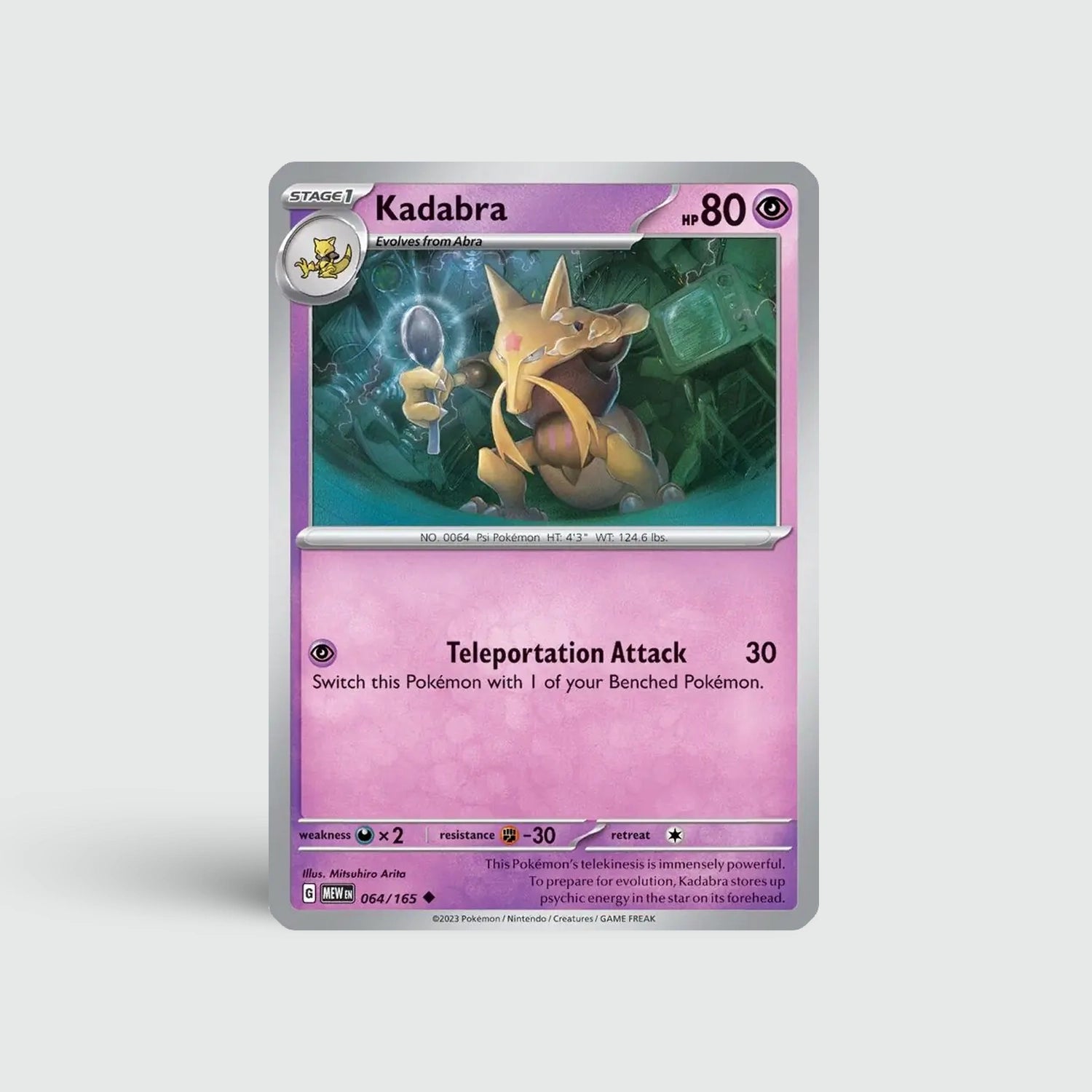 Kadabra laat de evolutie van Abra tot leven komen met krachtiger Psychic-energie en een herkenbaar, klassiek ontwerp. Een geliefde kaart voor verzamelaars die de volledige Alakazam-lijn compleet willen maken.