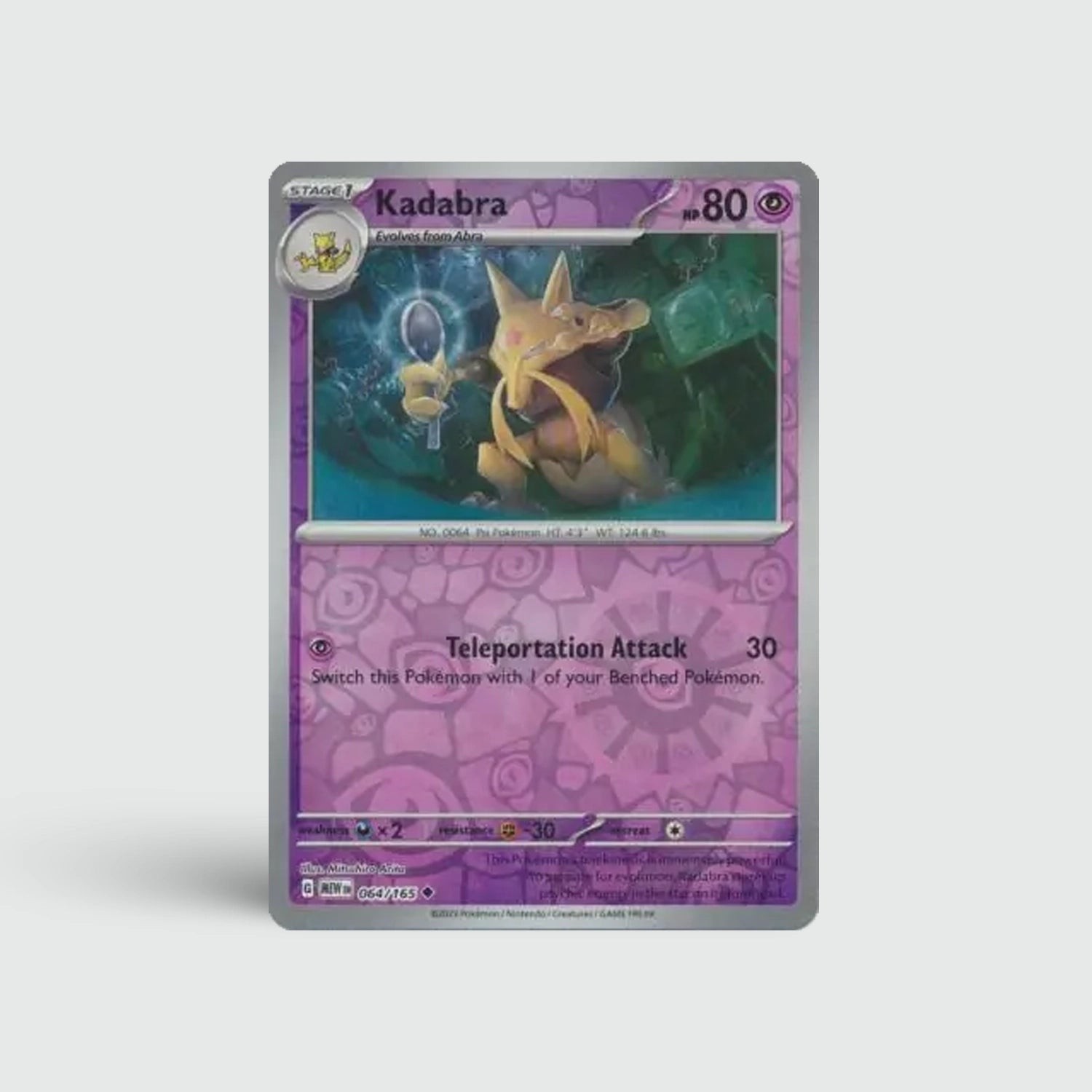 Kadabra laat de evolutie van Abra tot leven komen met krachtiger Psychic-energie en een herkenbaar, klassiek ontwerp. Een geliefde kaart voor verzamelaars die de volledige Alakazam-lijn compleet willen maken.