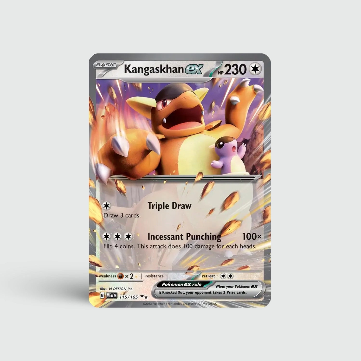 Kangaskhan EX levert krachtige aanvallen en een imposante aanwezigheid op het veld. Een sterke EX-kaart die meteen opvalt binnen de 151-collectie en een must-have is voor competitieve spelers.
