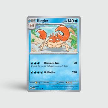 Kingler komt stevig binnen met zijn gigantische schaar en stoere uitstraling. Een sterke evolution card voor liefhebbers van de originele Kanto-Pokémon en een mooie aanvulling voor set-completers.