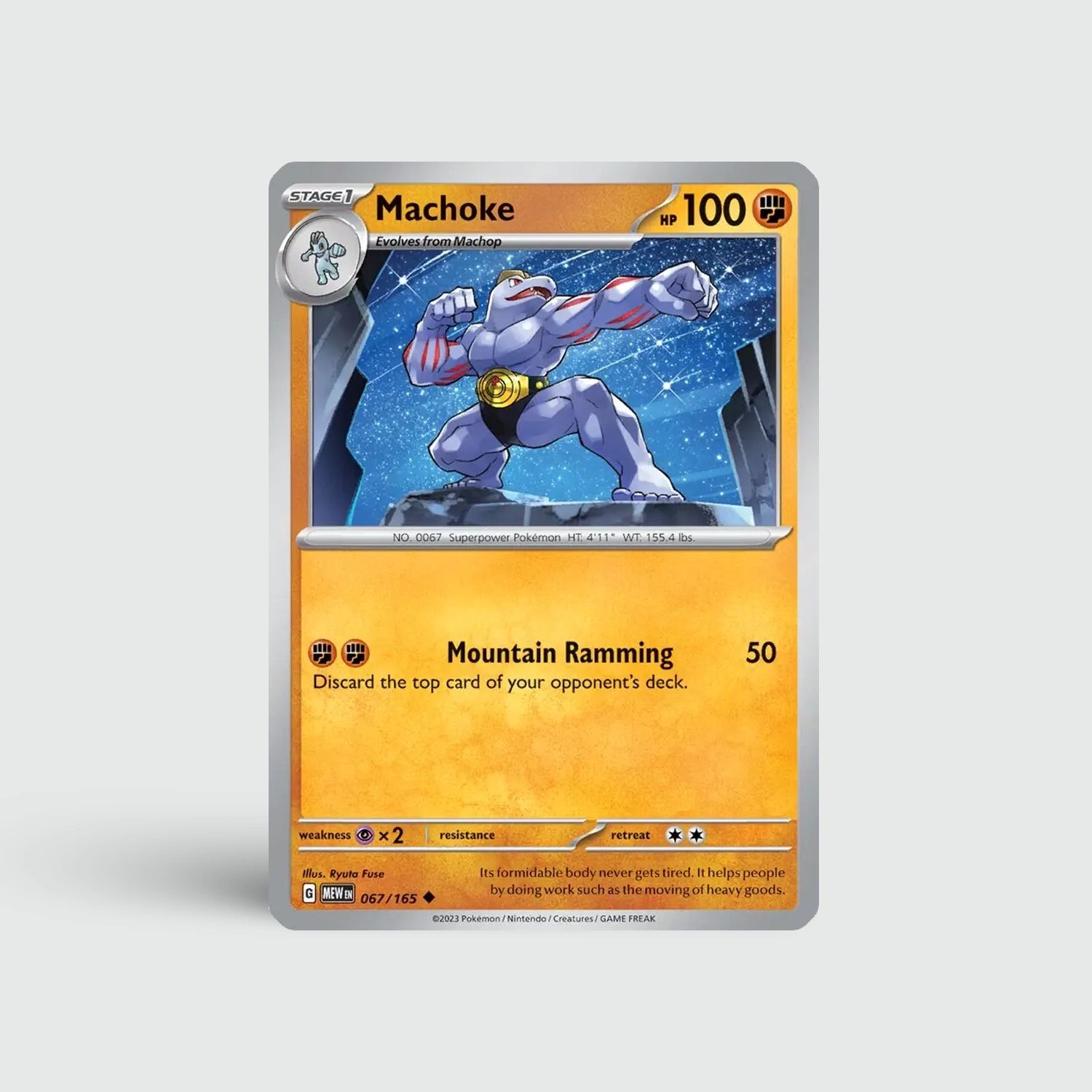 Machoke toont de evolutie van Machop in een sterker, gespierder ontwerp. Perfect voor fans die de volledige Fighting-lijn willen vervolledigen binnen de Scarlet & Violet: 151 set.