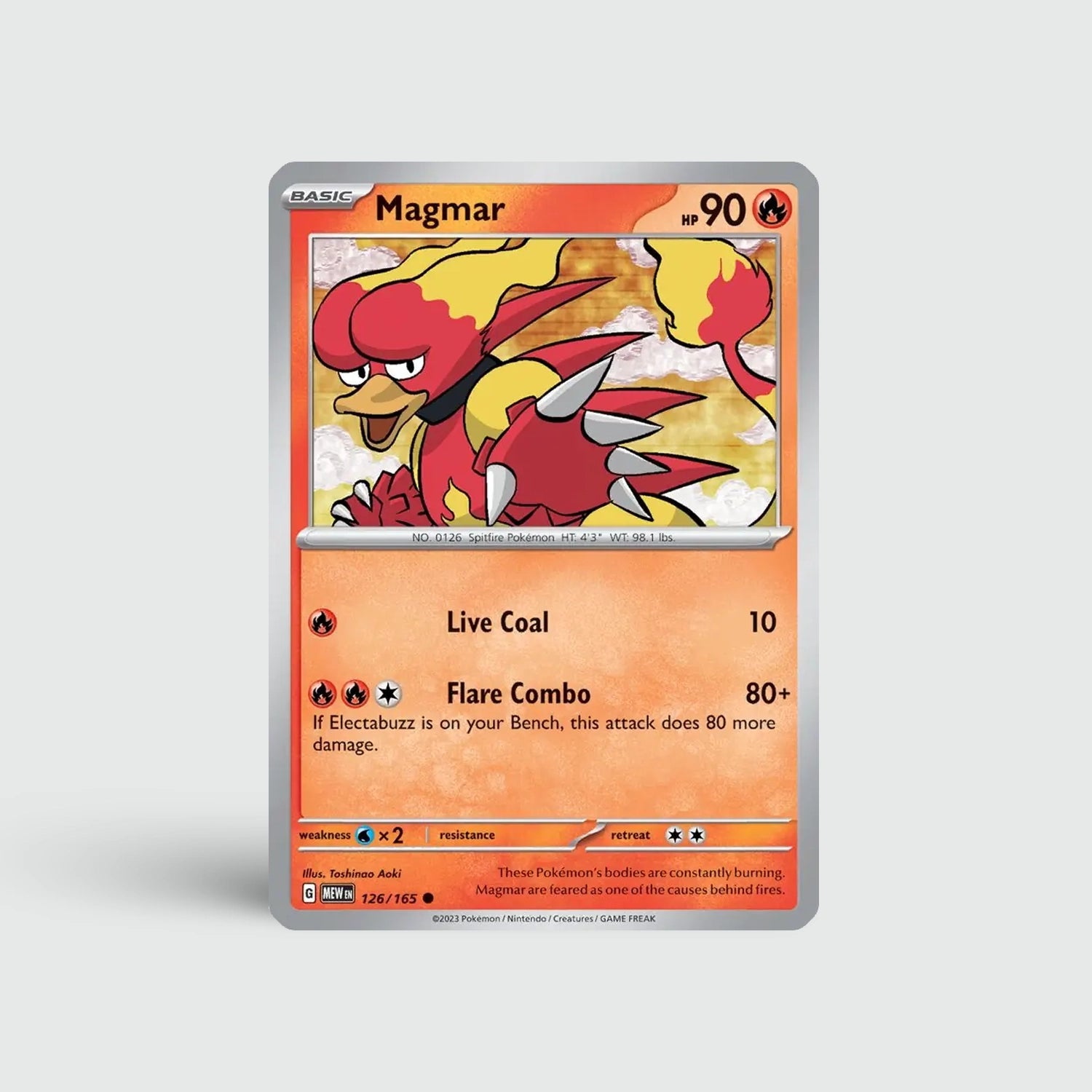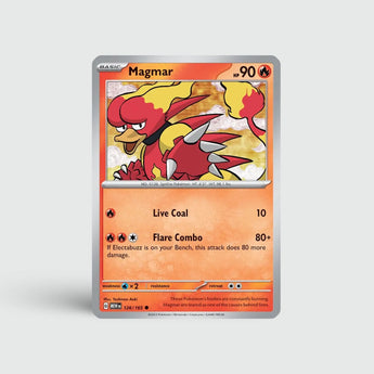 Magmar brengt vurige kracht en klassieke charme samen in één kaart. Zijn unieke design blijft een favoriet bij fans en verzamelaars. Een must-have voor iedereen die het Fire-type in 151 wil vervolledigen.