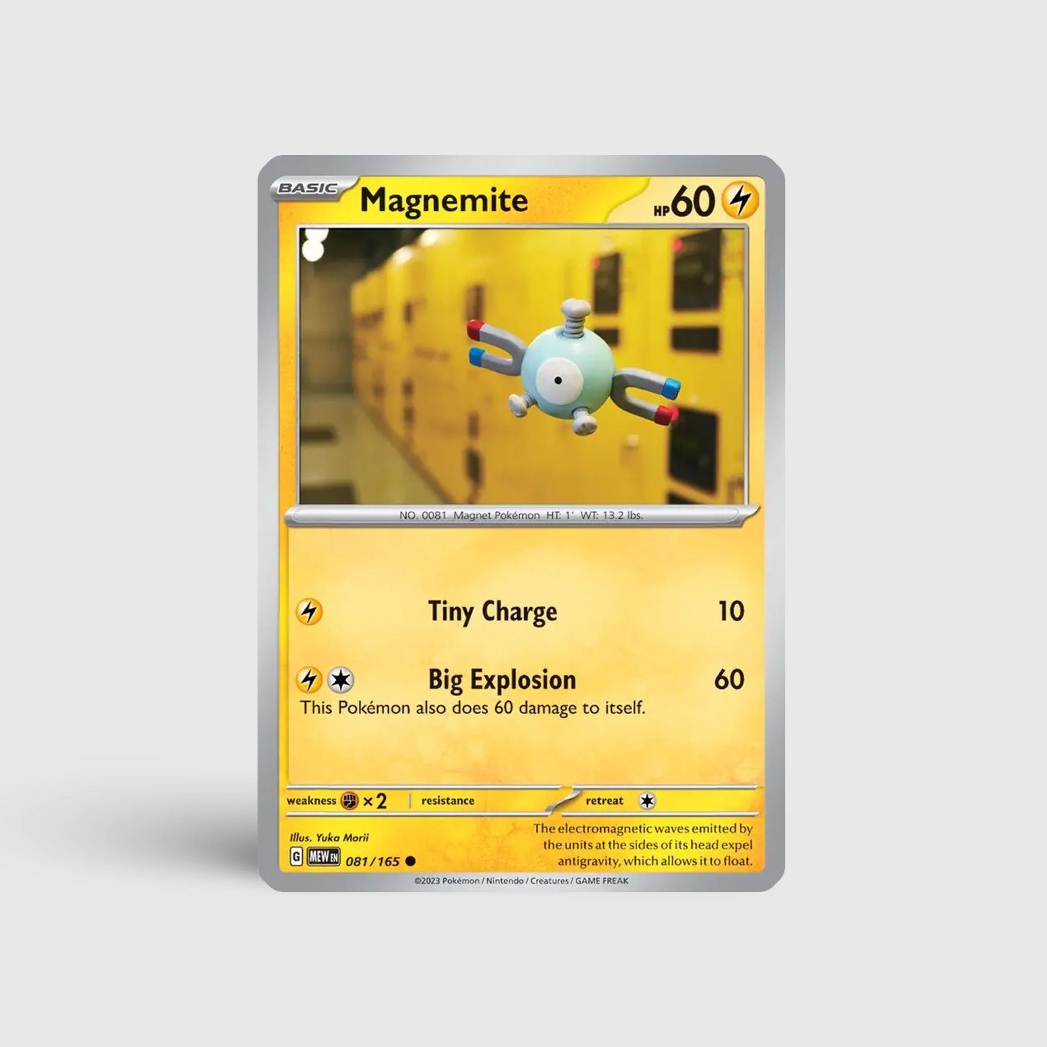 Magnemite is een nostalgische Electric/Steel Pokémon met een eenvoudig maar iconisch design. Deze kaart vormt een mooie basis voor wie de volledige Magnet-lijn wil opbouwen.