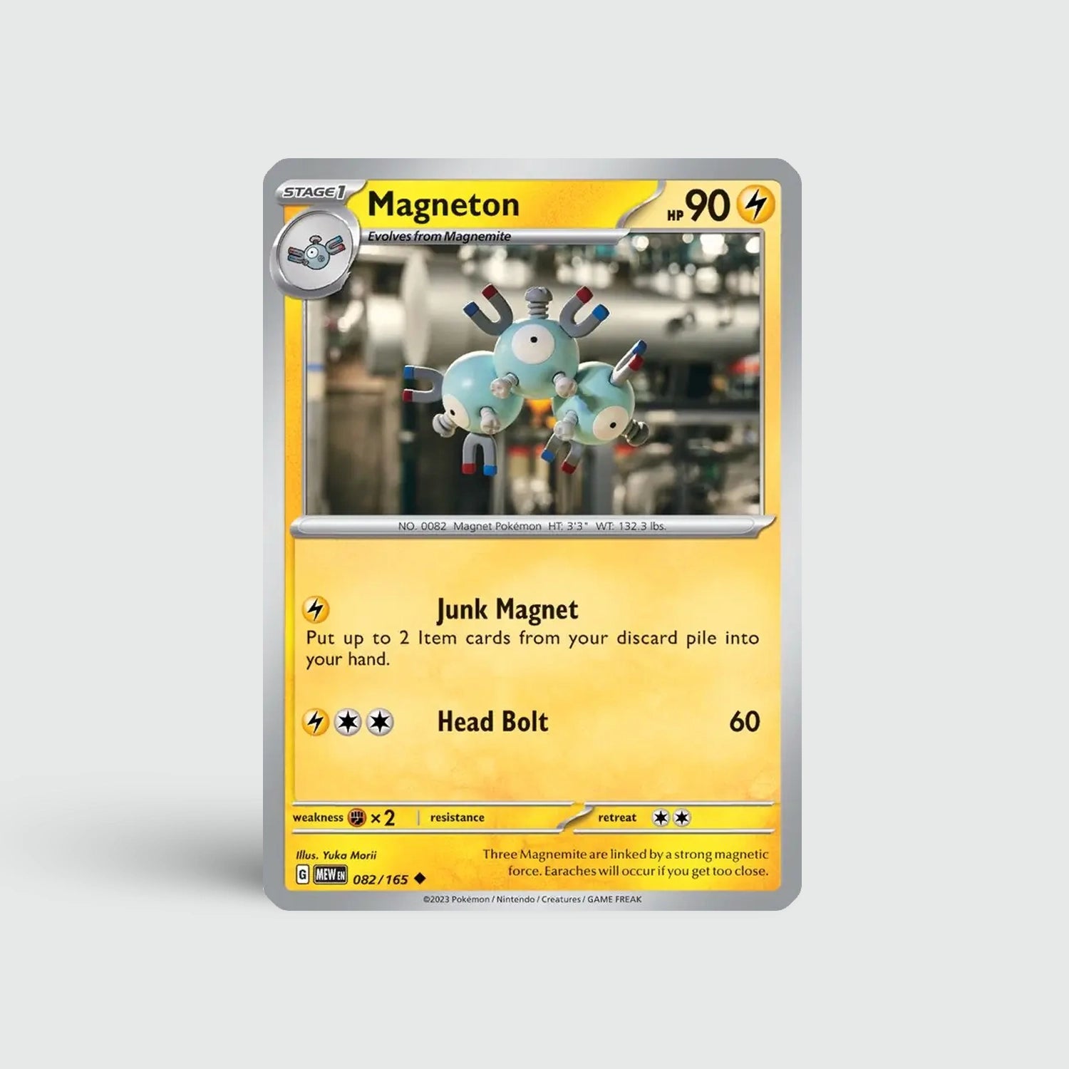 Magneton toont drie Magnemites die samen meer kracht en impact creëren. De kaart heeft een typische retro-uitstraling en is een vaste waarde in elke 151-collectie.