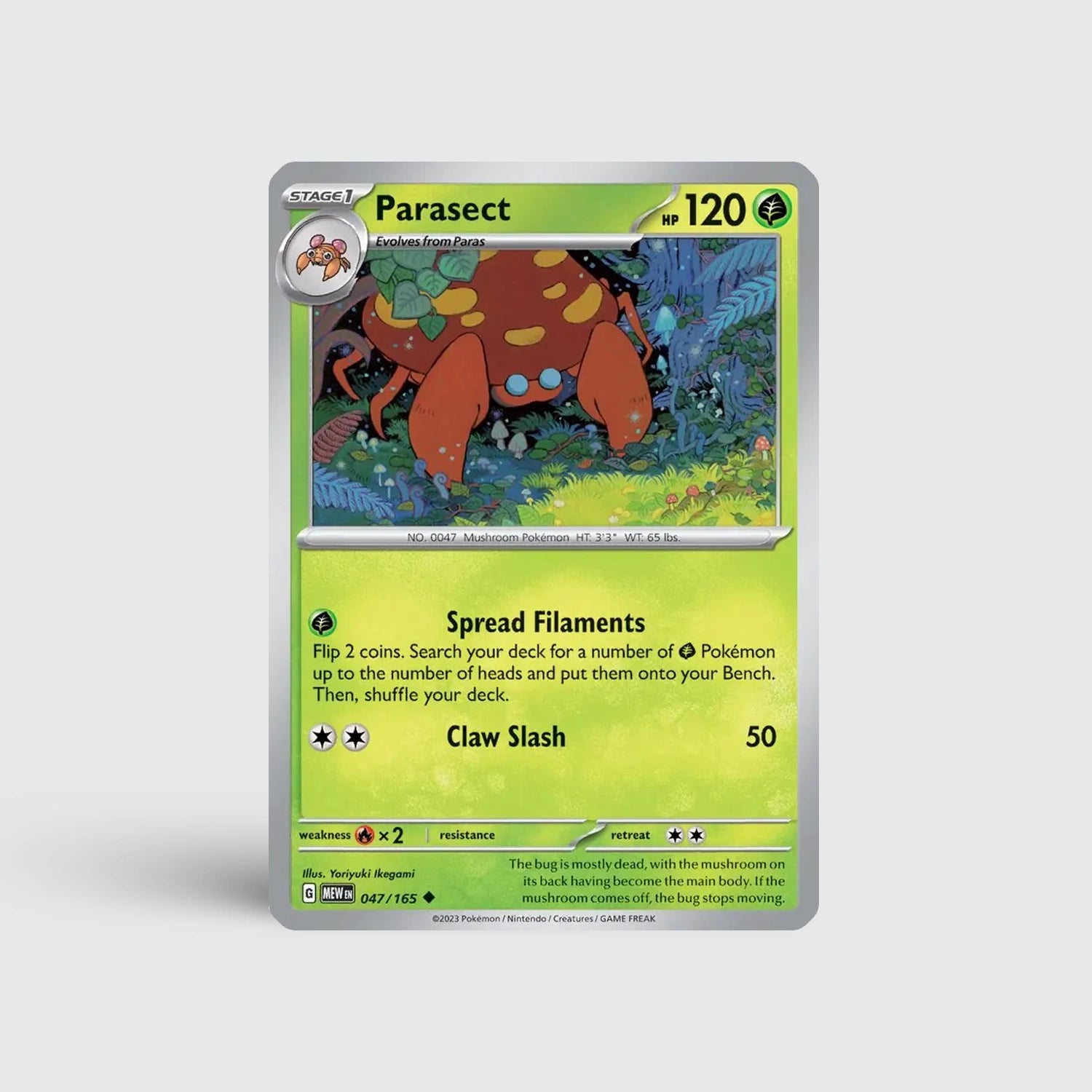 Parasect brengt het mysterieuze, paddenstoelachtige karakter van Paras volledig tot leven. Deze kaart is populair bij fans die houden van het meer bijzondere en ongewone Pokémon-design uit de 151-reeks.
