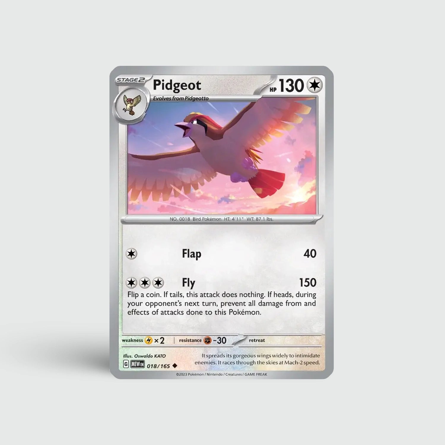 Pidgeot is een majestueuze Flying-type Pokémon die de evolutielijn naar een hoger niveau tilt. Deze kaart past perfect binnen elke 151-collectie en is populair bij zowel verzamelaars als spelers.