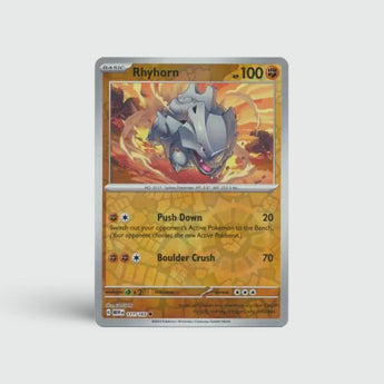 Rhyhorn is een robuuste Ground/Rock-type Pokémon uit de 151-set. Met zijn harde pantser en brutale charge-aanvallen is dit een herkenbare classic die elke verzameling sterker maakt.