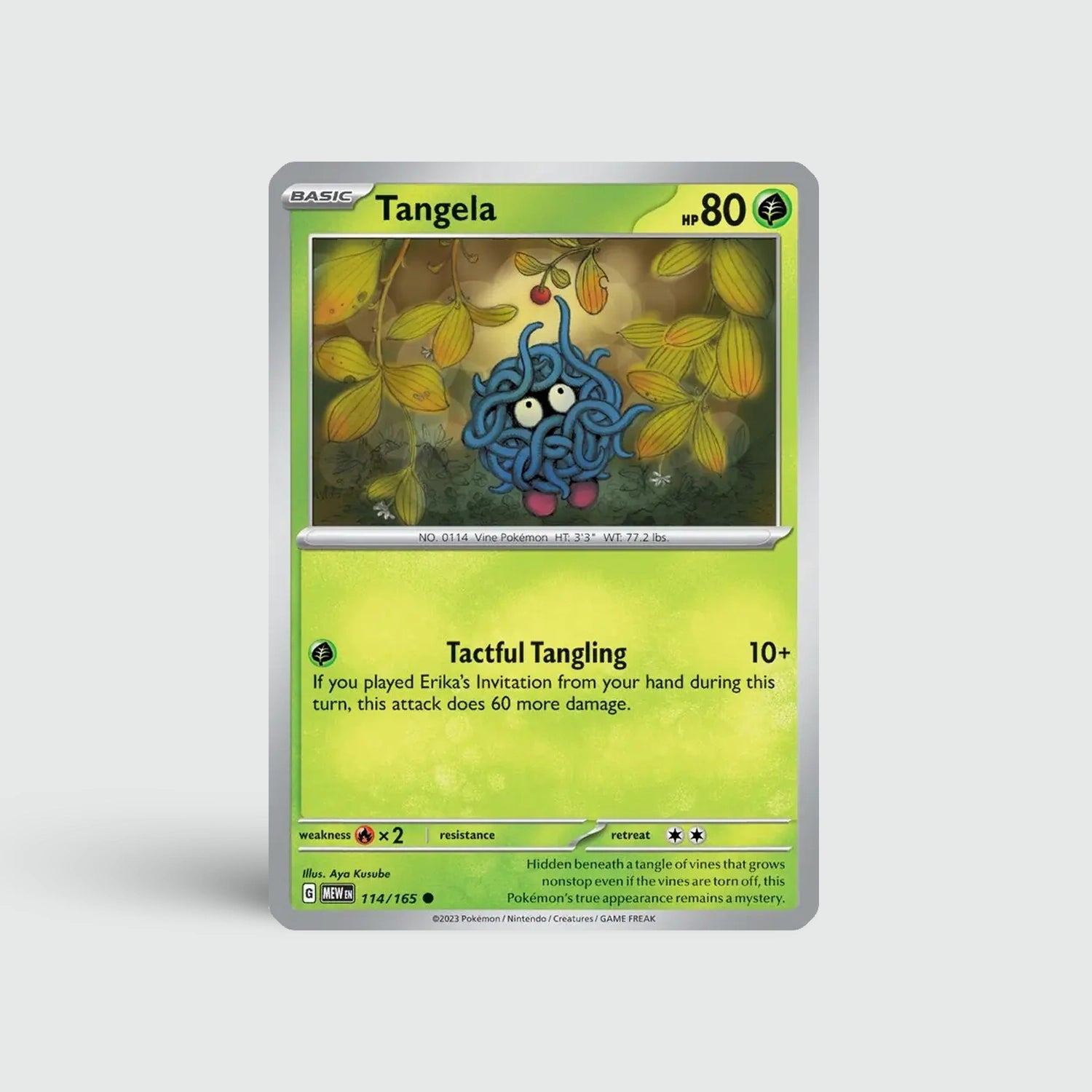 Tangela blijft een mysterieuze Grass-type Pokémon, omringd door kronkelende wijnstokken. Een leuke, kleurrijke toevoeging voor iedereen die start of uitbreidt binnen Generation 1.