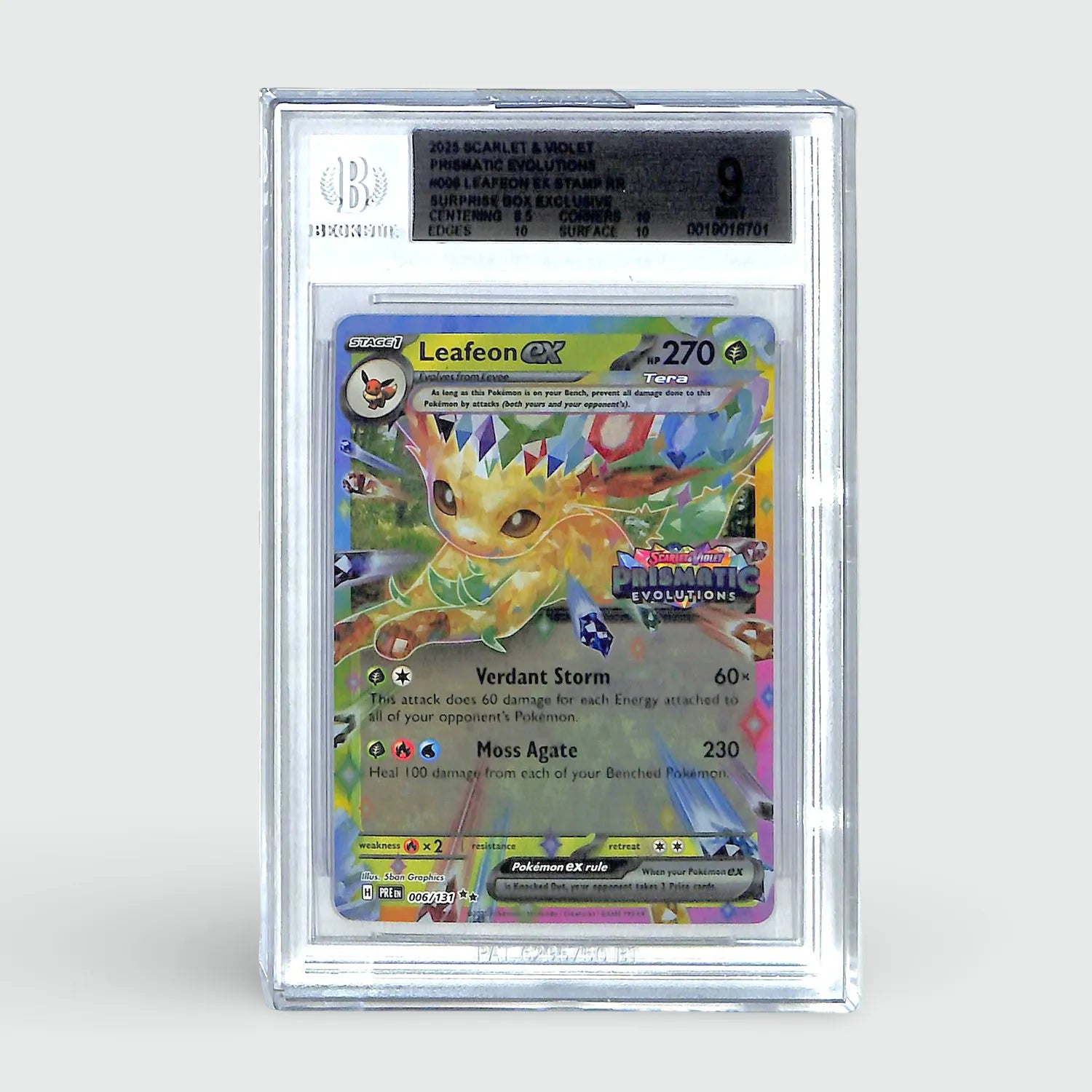 Leafeon ex (PRE 006) schittert met zijn Beckett Mint 9 beoordeling en unieke artwork. Een topkaart voor Pokémon fans en verzamelaars.
