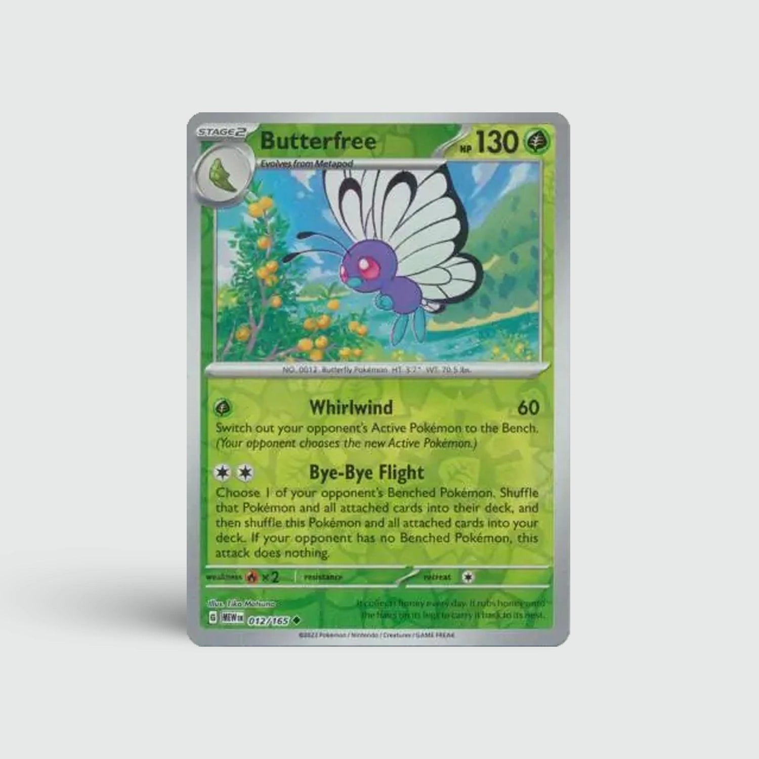 Butterfree brengt kleurrijk artwork en nostalgie samen in één kaart. Deze geliefde Bug-Flying Pokémon blijft een favoriet onder verzamelaars dankzij zijn herkenbare uitstraling en evolutiegeschiedenis.