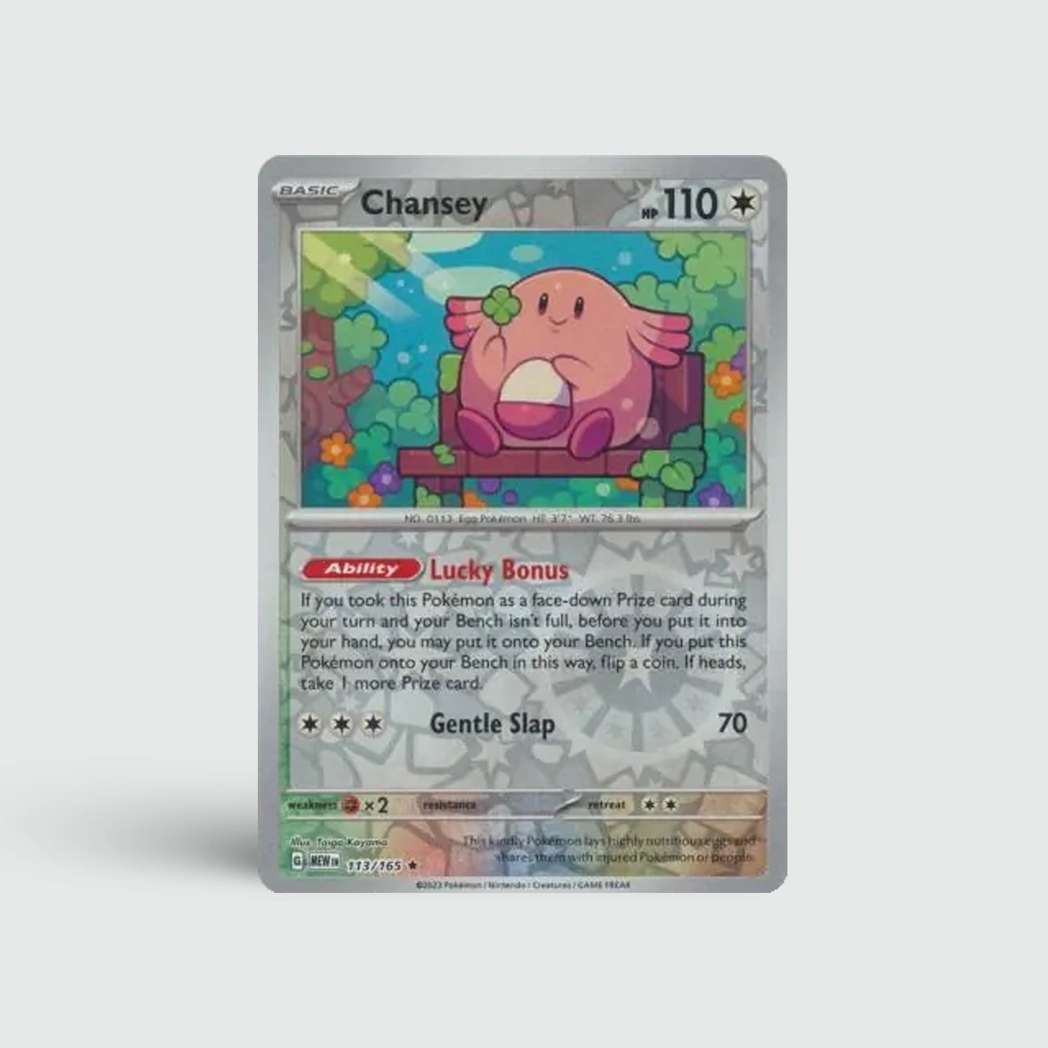 Chansey is een iconische support-Pokémon met hoge HP en een zachte uitstraling. Ideaal voor spelers en verzamelaars die houden van klassieke, vrolijke kaarten uit de 151-set.