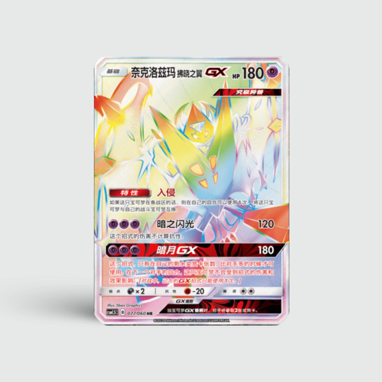 Dawn Wings Necrozma GX (CSM1.5C 077) toont betoverend Rainbow-artwork dat de mystiek van deze legende benadrukt.