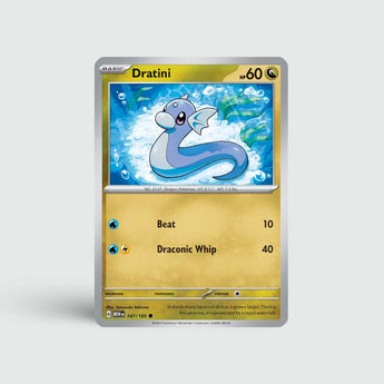 Dratini is de zachte, mysterieuze draak die elke 151-verzameling charmeert. Een schattige klassieker en een perfecte opbouw naar de Dragon-lijn.