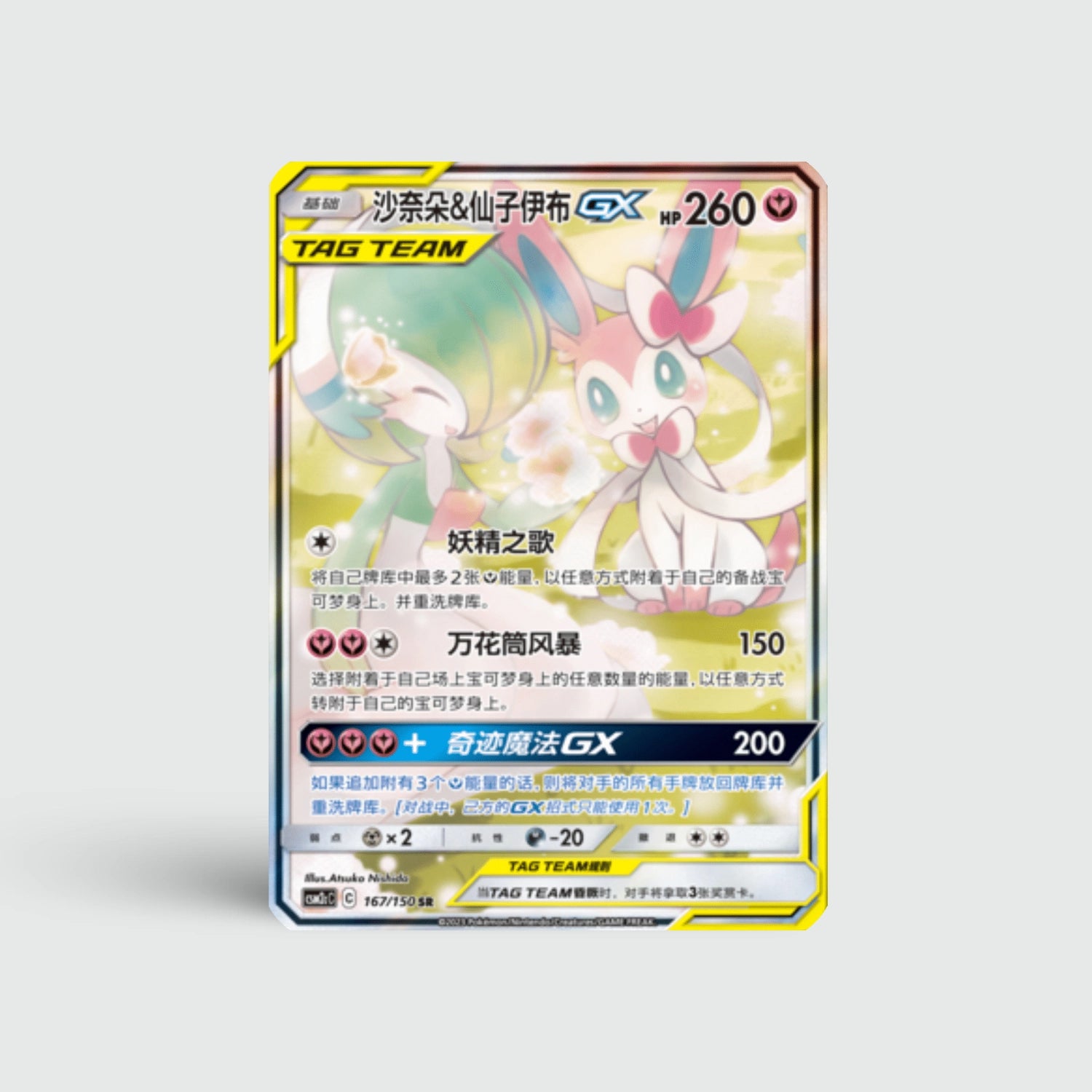 Gardevoir & Sylveon GX (CSM2cC 167) toont een alternatieve illustratie met zachte tinten en verfijnde details. Een zeldzame en artistieke uitvoering voor de echte liefhebber.