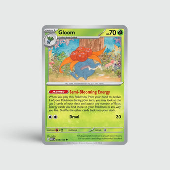 Gloom toont de evolutie van Oddish in een komischer maar krachtiger vorm. Deze kaart is perfect voor fans van de originele evolutielijn en sluit naadloos aan bij de nostalgische charme van de 151-set.