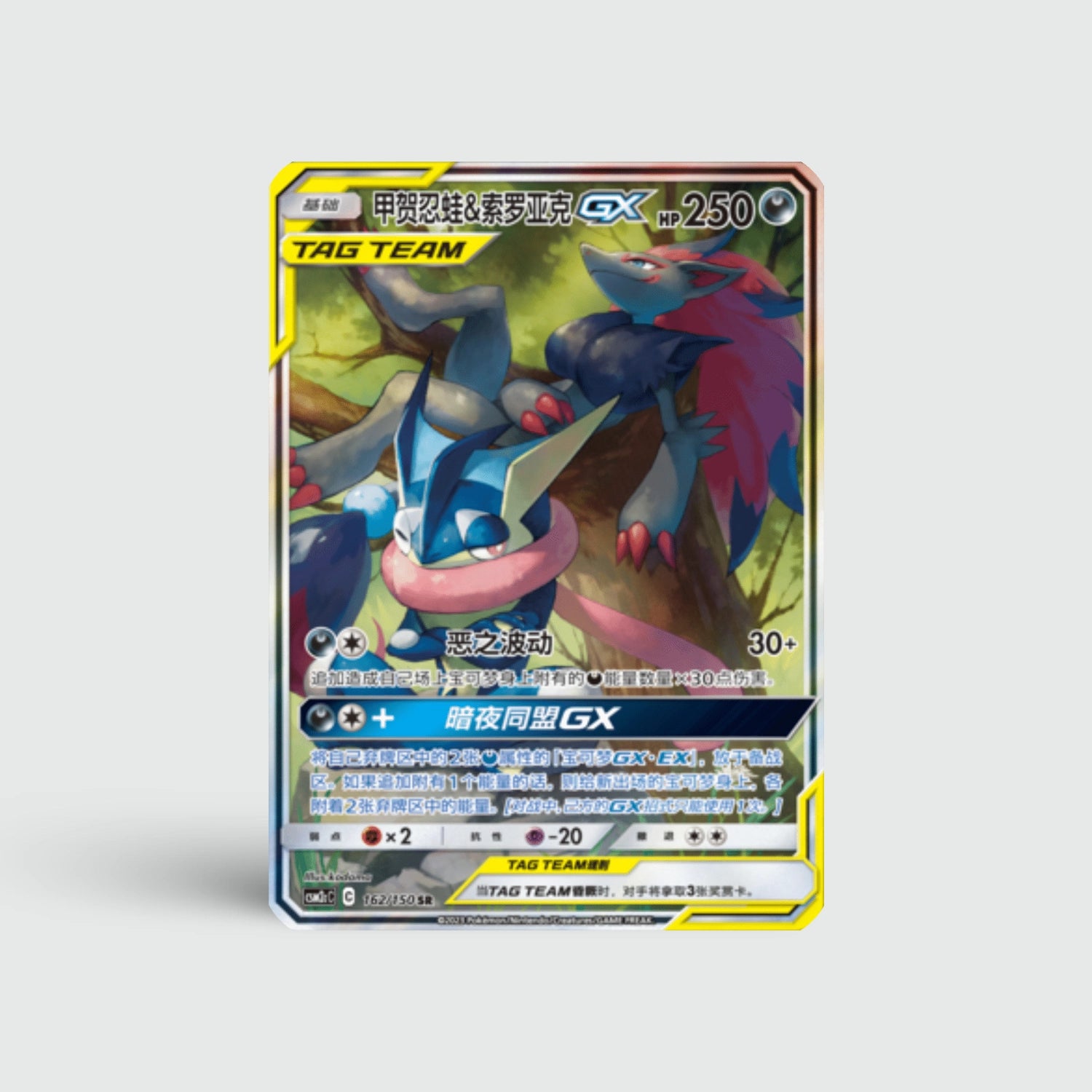 Greninja & Zoroark GX (CSM2cC 162) toont een alternatieve illustratie vol actie en contrast. Een zeldzame uitvoering die perfect de kracht van het duo weergeeft.