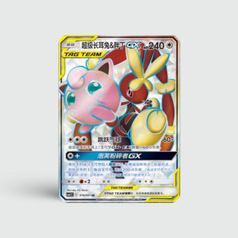 Mega Lopunny & Jigglypuff GX (CSM2.5C 076) straalt energie en vrolijkheid uit. Dit dynamische duo brengt speelsheid en kracht samen in één charmante GX-kaart.