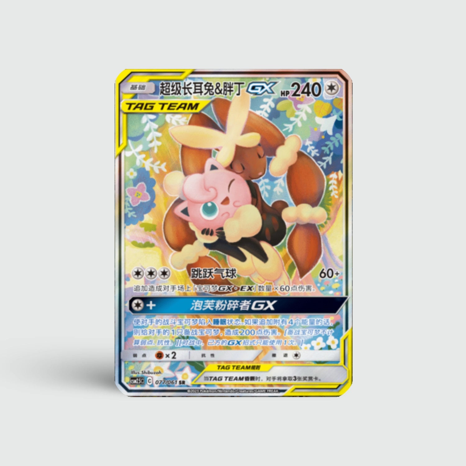 Mega Lopunny & Jigglypuff GX (CSM2.5C 077) toont een alternatieve illustratie met nog meer flair en levendigheid. Een sprankelende favoriet voor GX-verzamelaars.