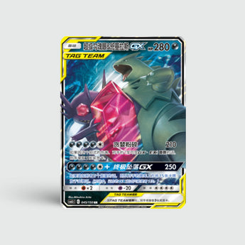 Mega Sableye & Tyranitar GX (CSM2cC 045) is een indrukwekkende Dark-type samenwerking. De combinatie van slimheid en brute kracht maakt dit duo een krachtpatser in elk deck.