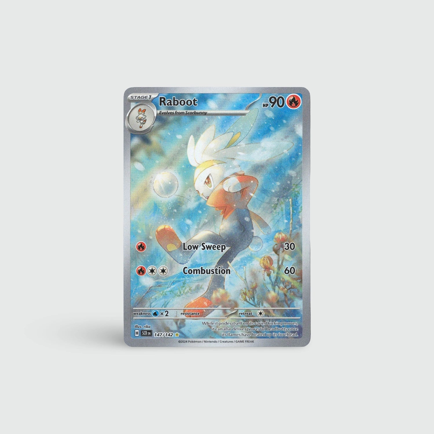 De Raboot kaart toont de energieke Fire-type Pokémon in een strak design. Een mooie aanvulling voor evolutielijnen en Fire-type collecties.