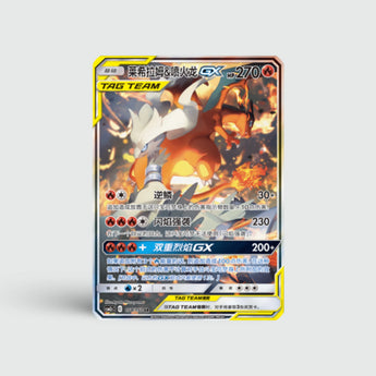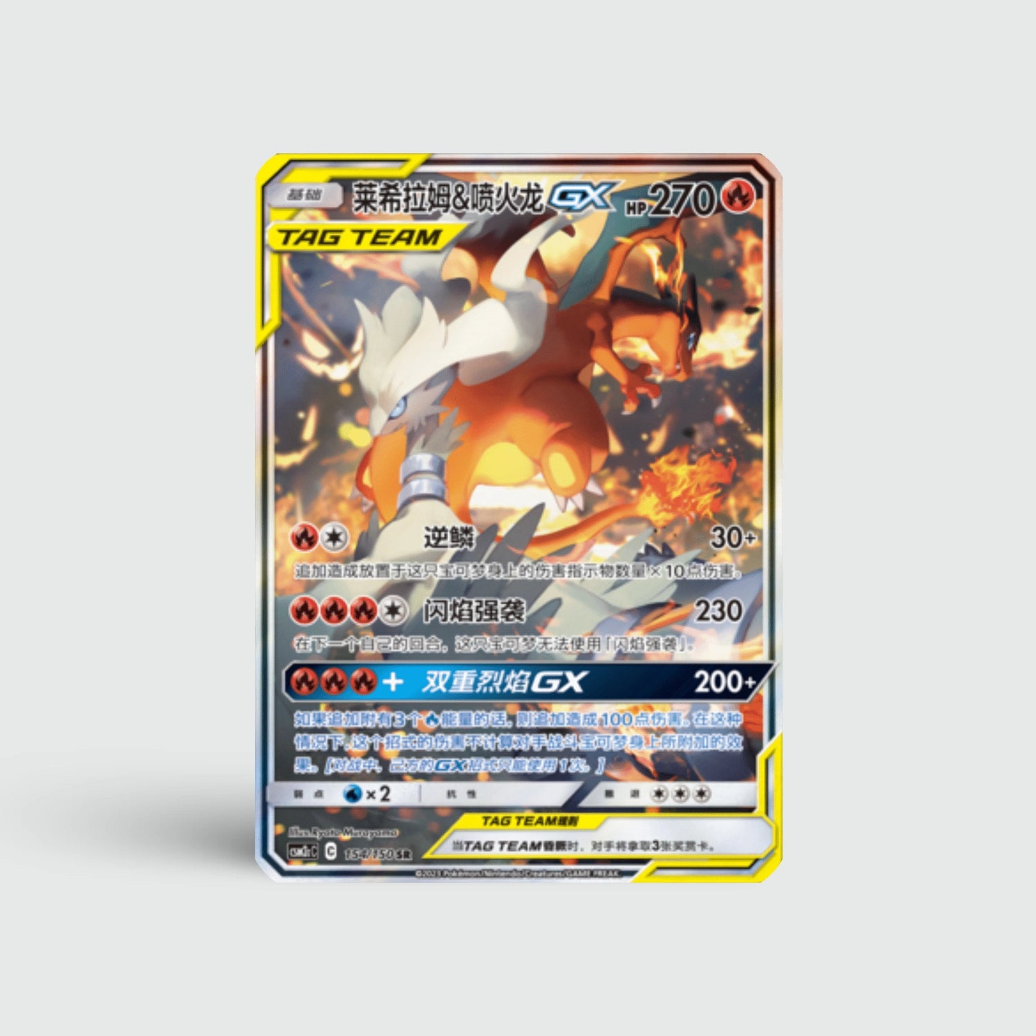 Reshiram & Charizard GX (CSM2cC 154) toont een alternatieve illustratie met intens detail. Een zeldzame en spectaculaire kaart die kracht en elegantie perfect combineert.