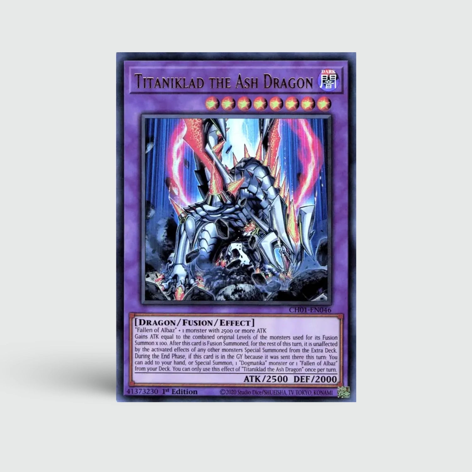 Titaniklad the Ash Dragon combineert hoge aanval met graveyard-utility. Hij zoekt of summon’t belangrijke Dogmatika- en Albaz-kaarten aan het einde van de beurt. Perfect voor setups.