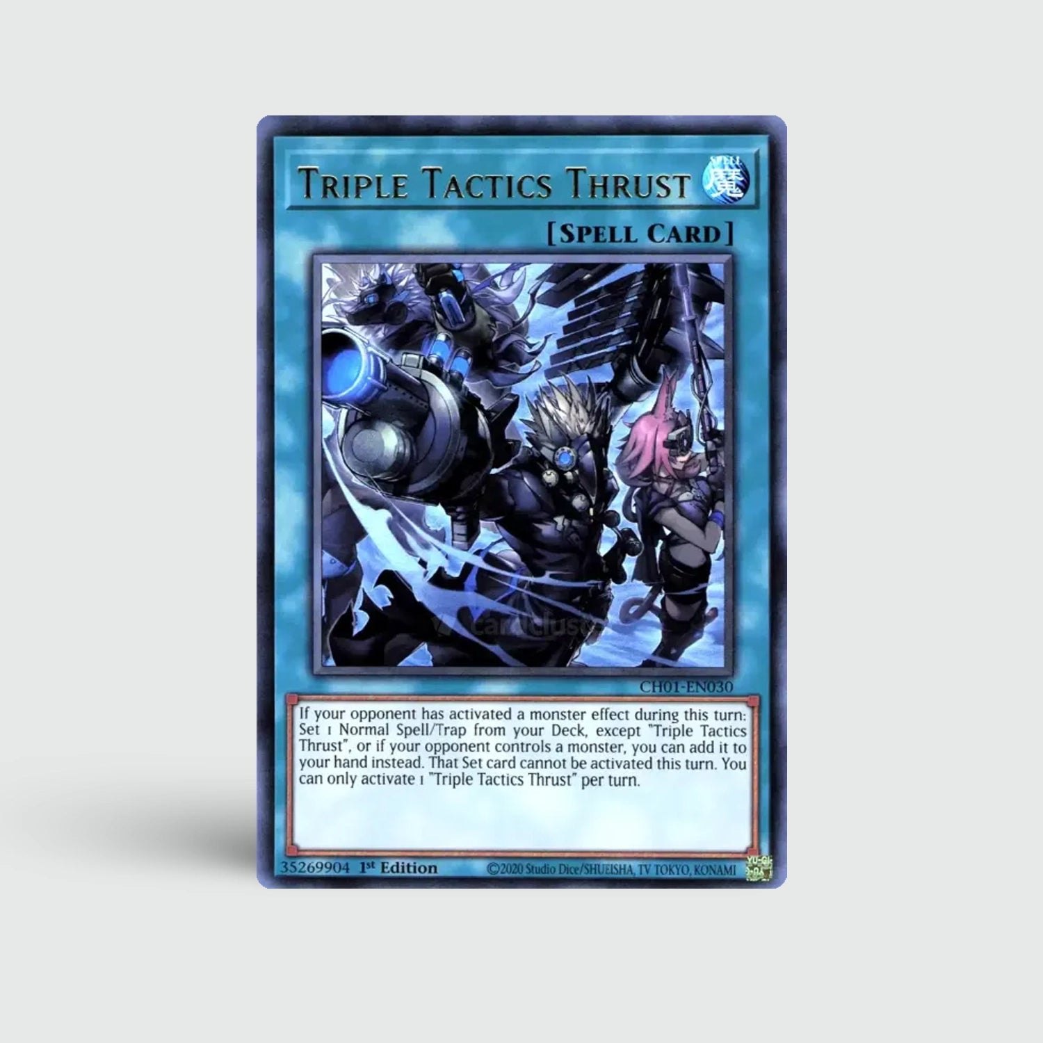 Triple Tactics Thrust is een premium spell die je elke belangrijke spell/trap kan zoeken wanneer je tegenstander je kaarten raakt. Flexibel, krachtig en enorm meta-relevant.