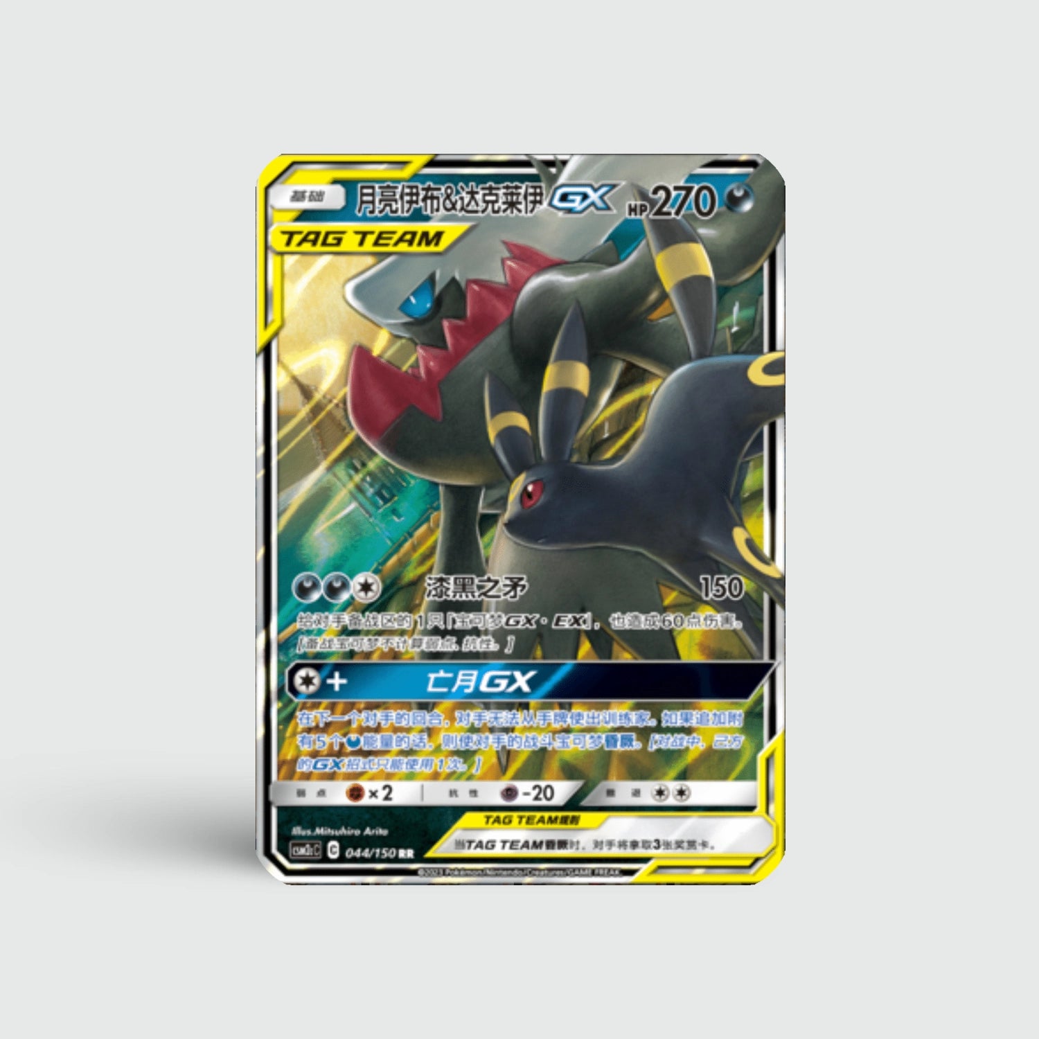 Umbreon & Darkrai GX (CSM2cC 044) combineert duistere elegantie met kracht. Dit Dark-type duo is geliefd om zijn mysterie en stijlvolle zwarte glans.