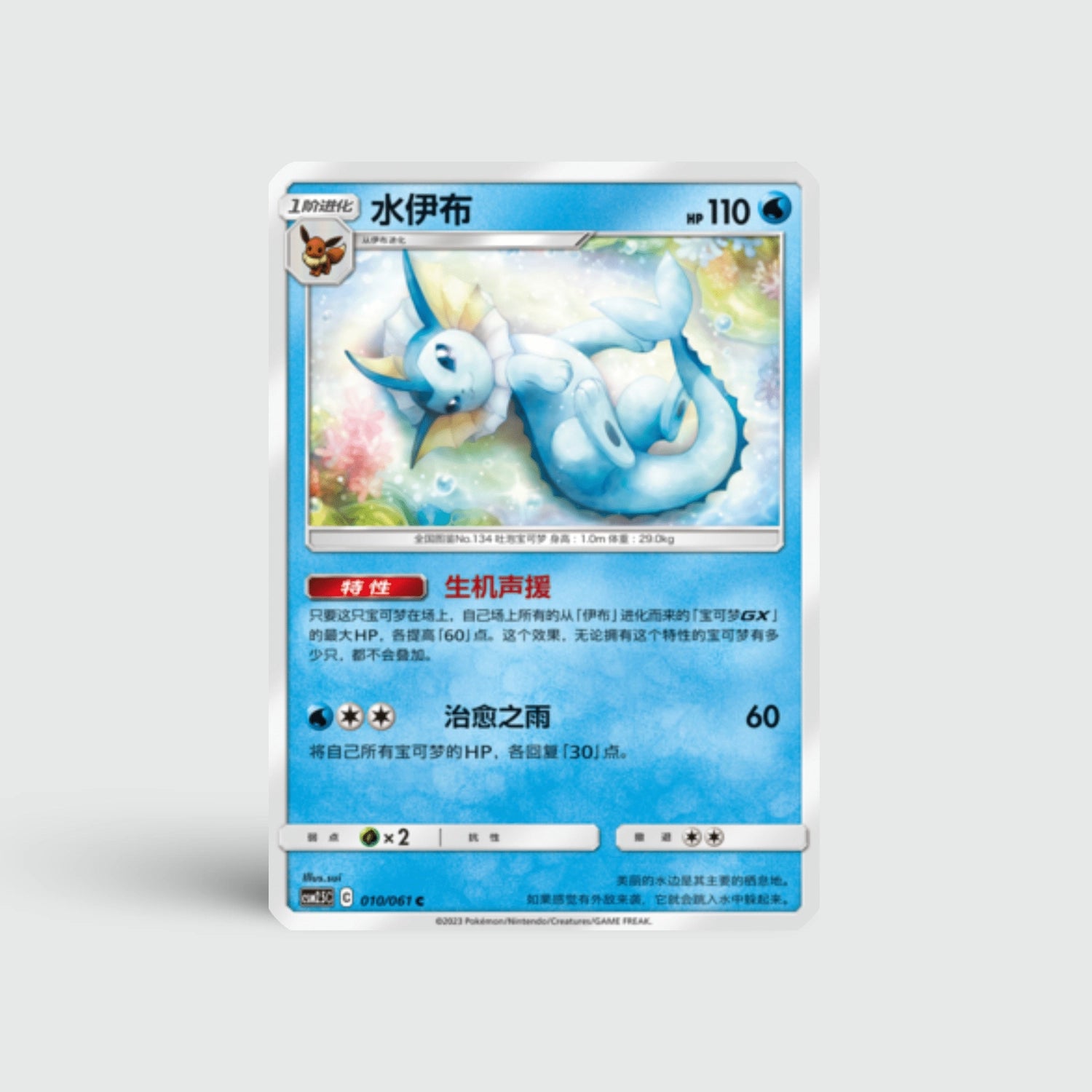 Vaporeon (CSM2.5C 010) straalt rust en elegantie uit. Deze Water-type evolutie van Eevee is geliefd om haar serene uitstraling en vloeiende illustratie.